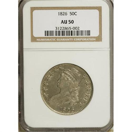 <B>1826 50C AU50 NGC.</B></I> NGC Census: (57/1172). PCGS Population (105/781). Mintage: 4,000,000. Numismedia Wsl. Price for NGC/PCGS coin in AU50: $340. (#6143)<BR><BR><B>Coin Engraver:</B> John Reich<BR><BR><b>Shipping:</b> Coins & Currency (<a target="_blank" href="http://www.heritageauctions.com/common/shipping.php">view shipping information</a>)