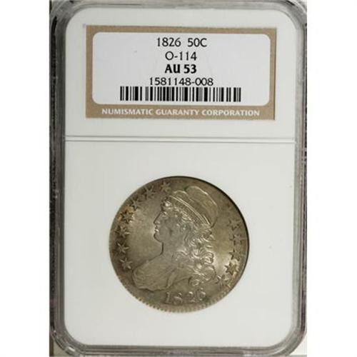 <B>1826 50C AU53 NGC.</B></I> O-114, R.4. The 2 in the date has a high serif. The upper angle of N in UNITED is filled. This is a pleasingly lustrous and originally toned example, with few marks and minimal highpoint wear for the grade. <BR><BR><B>Coin Engraver:</B> John Reich<BR><BR><b>Shipping:</b> Coins & Currency (<a target="_blank" href="http://www.heritageauctions.com/common/shipping.php">view shipping information</a>)
