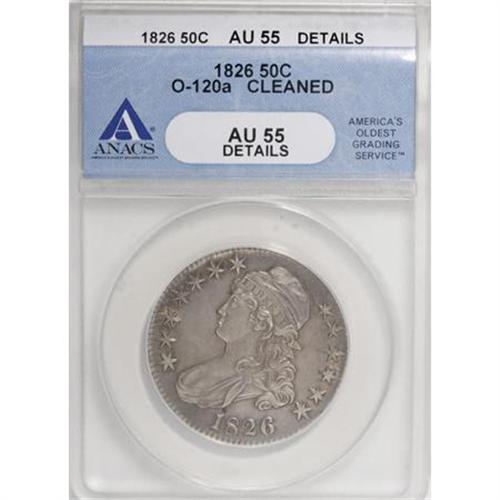 <B>1826 50C --Cleaned--ANACS. AU55 Details.</B></I> O-120a. NGC Census: (129/901). PCGS Population (159/514). Mintage: 4,000,000. Numismedia Wsl. Price for NGC/PCGS coin in AU55: $275. (#6143)<BR><BR><B>Coin Engraver:</B> John Reich<BR><BR><b>Shipping:</b> Coins & Currency (<a target="_blank" href="http://www.heritageauctions.com/common/shipping.php">view shipping information</a>)