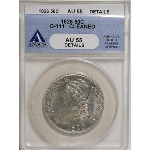 <B>1826 50C --Cleaned--ANACS. AU55 Details.</B></I> O-111. NGC Census: (131/937). PCGS Population (162/525). Mintage: 4,000,000. Numismedia Wsl. Price for NGC/PCGS coin in AU55: $450. (#6143)<BR><BR><B>Coin Engraver:</B> John Reich<BR><BR><b>Shipping:</b> Coins & Currency (<a target="_blank" href="http://www.heritageauctions.com/common/shipping.php">view shipping information</a>)