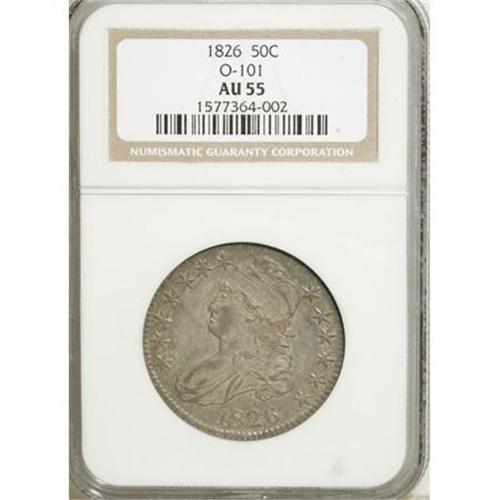 <B>1826 50C AU55 NGC.</B></I> O-101, R.1. Orange, mauve, and plum-red emerge when the deep gunmetal-gray surfaces are exposed to light. This patinated half dollar has the expected light wear on Liberty's curls and drapery. Faint field marks are concealed beneath the toning.<BR><BR><B>Coin Engraver:</B> John Reich<BR><BR><b>Shipping:</b> Coins & Currency (<a target="_blank" href="http://www.heritageauctions.com/common/shipping.php">view shipping information</a>)