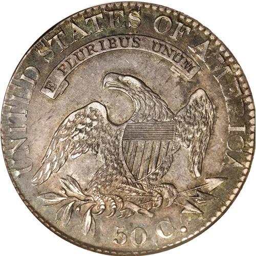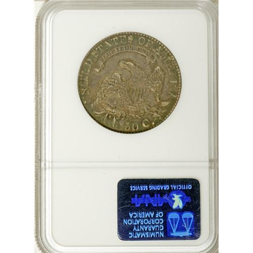 <B>1826 50C AU55 NGC.</B></I> O-115, Low R.5. Although not listed in Overton, it appears that this piece is a late die state example with a fine die crack from star 3 to star 7, continuing into the field over the cap. It is believed that this unlisted late die state is fully R.6, and probably high in that range. Both sides have deep gray color with hints of violet, framed by peripheral green and iridescent toning. For the advanced specialist, this is an extremely important opportunity, apparently one of the finest known examples of the "O-115a" die state.<BR><I>From The Westmoreland, Virginia Collection, Part Two.</B></I><BR><BR><b>Shipping:</b> Coin/Currency (<a target="_blank" href="http://www.heritageauctions.com/common/shipping.php">view shipping information</a>)