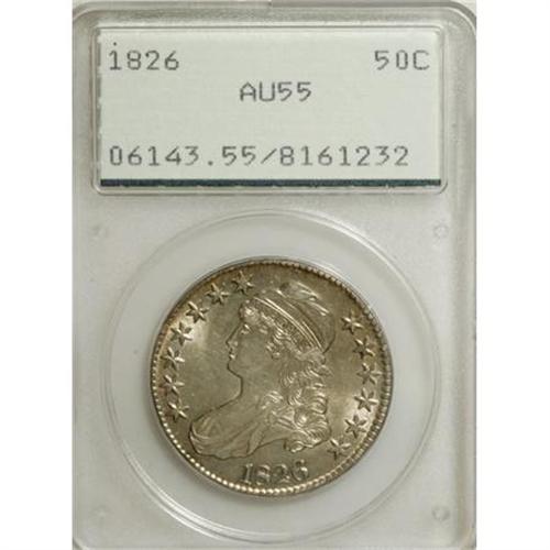 <B>1826 50C AU55 PCGS.</B></I> PCGS Population (150/493). NGC Census: (126/668). Mintage: 4,000,000. Numismedia Wsl. Price for NGC/PCGS coin in AU55: $275. (#6143)<BR><BR><B>Coin Engraver:</B> John Reich<BR><BR><b>Shipping:</b> Coins & Currency (<a target="_blank" href="http://www.heritageauctions.com/common/shipping.php">view shipping information</a>\)