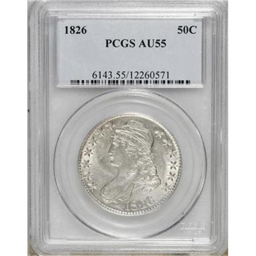 <B>1826 50C AU55 PCGS.</B></I> . PCGS Population (162/525). NGC Census: (131/937). Mintage: 4,000,000. Numismedia Wsl. Price for NGC/PCGS coin in AU55: $450. (#6143)<BR><BR><B>Coin Engraver:</B> John Reich<BR><BR><b>Shipping:</b> Coins & Currency (<a target="_blank" href="http://www.heritageauctions.com/common/shipping.php">view shipping information</a>)