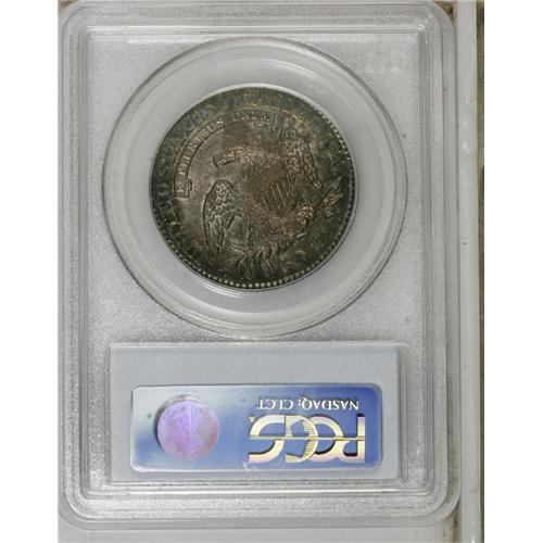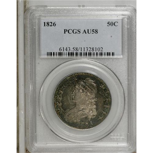 <B>1826 50C AU58 PCGS.</B></I> O-116a, R.1. Richly toned in gold, aqua-blue, and mauve shades. Luster flashes across the borders and devices. A pair of mint-made strike-throughs above the eagle's right shoulder are of little consequence.<BR><BR><b>Shipping:</b> Coins & Currency (<a target="_blank" href="http://www.heritageauctions.com/common/shipping.php">view shipping information</a>)