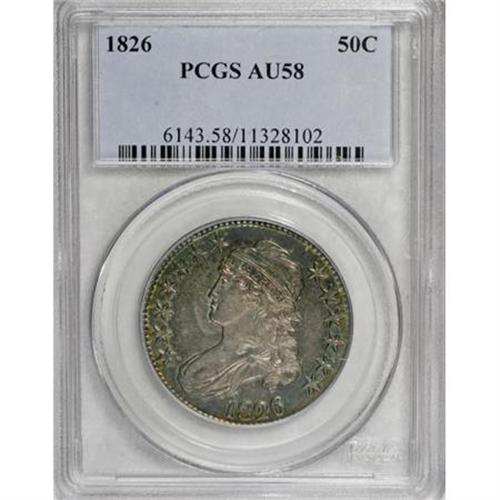<B>1826 50C AU58 PCGS.</B></I> PCGS Population (157/359). NGC Census: (260/665). Mintage: 4,000,000. Numismedia Wsl. Price for NGC/PCGS coin in AU58: $650. (#6143)<BR><BR><B>Coin Engraver:</B> John Reich<BR><BR><b>Shipping:</b> Coins & Currency (<a target="_blank" href="http://www.heritageauctions.com/common/shipping.php">view shipping information</a>)