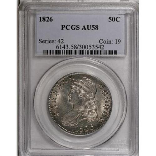 <B>1826 50C AU58 PCGS.</B></I> PCGS Population (161/369). NGC Census: (262/678). Mintage: 4,000,000. Numismedia Wsl. Price for NGC/PCGS coin in AU58: $675. (#6143)<BR><BR><B>Coin Engraver:</B> John Reich<BR><BR><b>Shipping:</b> Coins & Currency (<a target="_blank" href="http://www.heritageauctions.com/common/shipping.php">view shipping information</a>)