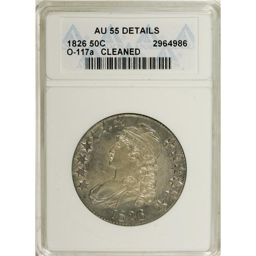 <B>1826 50C --Cleaned--ANACS. AU55 Details.</B></I> O-117a. NGC Census: (125/661). PCGS Population (150/494). Mintage: 4,000,000. Numismedia Wsl. Price for NGC/PCGS coin in AU55: $275. (#6143)<BR><BR><b>Shipping:</b> Coins & Currency (<a target="_blank" href="http://www.heritageauctions.com/common/shipping.php">view shipping information</a>)