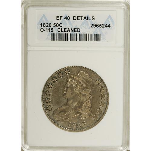 <B>1826 50C --Cleaned--ANACS. XF40 Details.</B></I> O-115. NGC Census: (25/972). PCGS Population (56/883). Mintage: 4,000,000. Numismedia Wsl. Price for NGC/PCGS coin in XF40: $82. (#6143)<BR><BR><b>Shipping:</b> Coins & Currency (<a target="_blank" href="http://www.heritageauctions.com/common/shipping.php">view shipping information</a>)