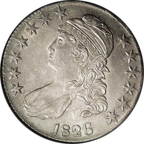 <B>1826<50C>--Improperly Cleaned--NCS. AU Details.</B></I> O-107, R.3. Attributable by the hair curl that penetrates the base of the L in LIBERTY, and ED in UNITED joined at the base on the reverse. This is an improperly cleaned example, with faint hairlines on each side and a handful of small contact marks on Liberty's face. Well struck except for the right side stars, and each side is overlaid with rich olive-gray and apricot-gold toning.<BR><I>Ex: J.J. Teaparty (8/2/1985).</B></I> Envelope Included.