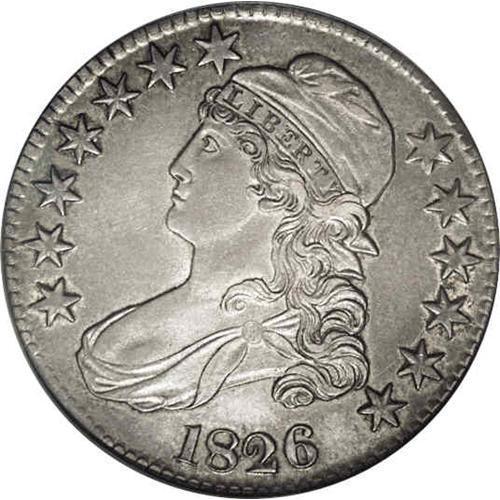 <B>1826<50C>--Improperly Cleaned--NCS. AU Details.</B></I> O-110, R.2. The 8 in the date is recut within the upper loop. Well struck with deep olive-gray toning over both sides, along with strong undertones of rose, cobalt-blue, and gold. Highpoint wear is extremely minor, and distracting marks or abrasions are non-existent. An attractive piece, despite the improper cleaning. Envelope Included.
