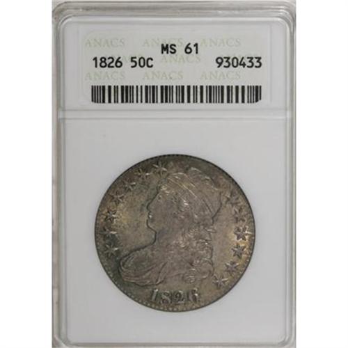 <B>1826 50C MS61 ANACS.</B></I> O-120a, R.3. The lengthy reverse die cracks are distinct. Meticulously struck and satiny with rich lime, gold, and mauve shades. A moderate mark on the neck, but otherwise well preserved.<BR><BR><B>Coin Engraver:</B> John Reich<BR><BR><b>Shipping:</b> Coins & Currency (<a target="_blank" href="http://www.heritageauctions.com/common/shipping.php">view shipping information</a>)