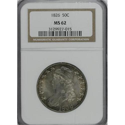 <B>1826 50C MS62 NGC.</B></I> O-118a, R.1. The reverse shows a line through the first U and N of UNUM, which is diagnostic, and shows the peripheral die cracks associated with the O-118a subtype. A luminous and well-defined piece that shows few marks for the grade. Satiny pink-silver centers cede to peach and sage at the margins.<BR><BR><B>Coin Engraver:</B> John Reich<BR><BR><b>Shipping:</b> Coins & Currency (<a target="_blank" href="http://www.heritageauctions.com/common/shipping.php">view shipping information</a>)