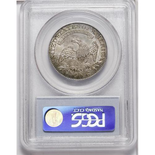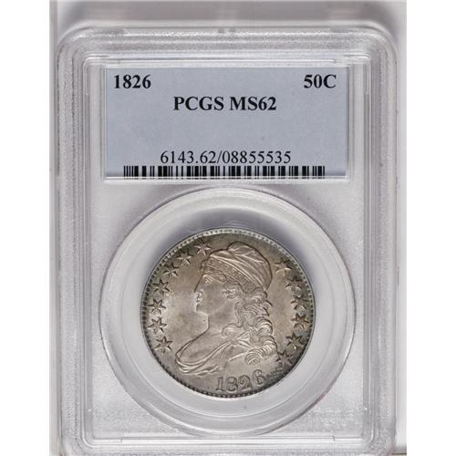 <B>1826<50C> MS62 PCGS.</B></I> O-110, R.2. Attractive chestnut, pearl-gray, and apple-green toning drapes this satiny and nicely struck representative. A minor mark in front of the beak will identify the present piece.