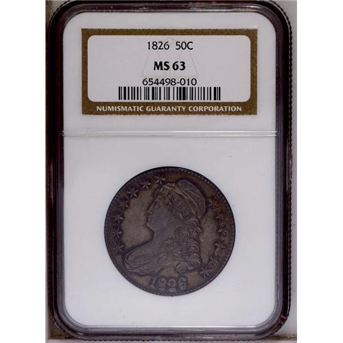 <B>1826<50C> MS63 NGC.</B></I> O-102, R.1. A variety easily distinguished by the 6 in the date higher than the remaining digits. On the reverse the top left serif of the first T in STATES is disconnected, and UN in UNITED nearly join. This example has muted copper-gray surfaces with deep brownish-gray at the rim devices. Despite the rather deep toning--which apparently accounts for the grade, since no other visible impediments are noted--there is considerable mint luster present beneath. An attractive coin, and boldly struck, as well. <BR><BR><B>Important notice:</B> Heritage usually auctions material at the rate of 200-250 lots per hour. On some occasions eBay Live bid software or the Internet may not be able to keep up with the pace of the auction. We recommend placing a realistic absentee bid now as insurance to avoid disappointment. Occasionally the auctioneer may eliminate or reject an eBay Live bid, and the auctioneer may also reopen a lot after the close of the eBay live bidding (usually because we missed an audience bid), and may reject your bid even if it shows you as the winning bidder. By bidding via eBay Live, you agree that Heritage may award the lot to another bidder at its sole discretion under the circumstances described above or any other reasonable circumstances. Since eBay bids are not shown to us until we open the lot on the floor, we treat those bids just like floor bids. In most cases the floor responds before the eBay bid is presented to us, due to Internet lag time, so for consistency we have made it a policy that floor bids are always considered first over tie eBay live bids. Also please note that all Heritage lots purchased through eBay Live carry a 20% Buyer's Premium. Please make sure you read the Terms and Conditions before you bid. This lot is being auctioned in conjunction with a live floor auction by Heritage Galleries & Auctioneers. All final auction and invoice information will be supplied by Heritage Galleries & Auctioneers, and all other information should be considered preliminary. Lot:1955 <BR><BR><B>Winning Notification and Billing:</B> After the FINAL session in this auction is complete, Heritage will send e-mail and snail mail invoices. This process normally takes several days. All final auction and invoice information will be supplied by Heritage Galleries & Auctioneers, and all other information should be considered preliminary. <BR><BR>This auction will be conducted on a live auction floor and over the Internet through eBay Live. If you choose to place an absentee bid, please take a moment to <font color='#0000ff'><u><a href='http://pages.ebay.com/liveauctions/help/before/laabsentee.html'>learn how eBay Live absentee bidding works</a></u></font><font color='#000000'>