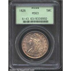 1826 50C MS63 PCGS.  O-108a, R.1. A smooth, highly lustrous example with a delicate overlay of golden patina on each side. Several peripheral die cracks make this more available variety an easy attribution.  Important notice: We expect to be auctioning lots at the rate of 200-250 per hour. Sometimes eBay Premier live bid software cannot keep up with that pace, so we strongly recommend that you place a realistic proxy bid now as insurance to avoid disappointment. Also please note that all Heritage/CAA lots purchased through eBay Premier carry a 20% Buyer's Premium.