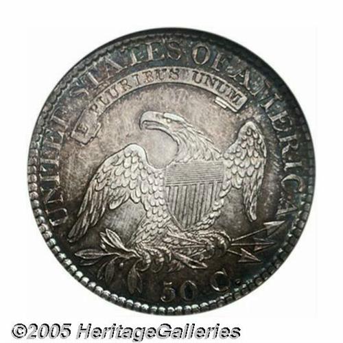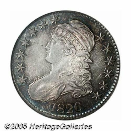 <B>1826<50C> MS64 NGC.</B></I> O-102, R.1. Gorgeous electric-blue and peach-gold colors embrace this well struck Capped Bust Half Dollar. The disjointed left serif of the second T in STATES aids the attribution of the die pairing. Beautiful to the naked eye, examination under a loupe finds a scratch near the right side stars and a few wispy slide marks in the obverse field.
