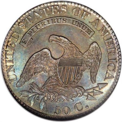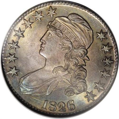 <B>1826 50C MS64 NGC.</B></I> O-111, R.2. The obverse has the die crack specified in O-111a, but the reverse lacks the Overton-mentioned die crack near AMERICA. An evenly struck and satiny example with impressively smooth surfaces. The obverse is rose-gray, ocean-blue, and caramel-gold. The reverse has an aquamarine center and light gold and cherry-red margins.<BR><BR><B>Coin Engraver:</B> John Reich<BR><BR><b>Shipping:</b> Coins & Currency (<a target="_blank" href="http://www.heritageauctions.com/common/shipping.php">view shipping information</a>)