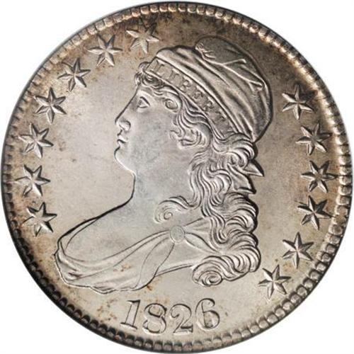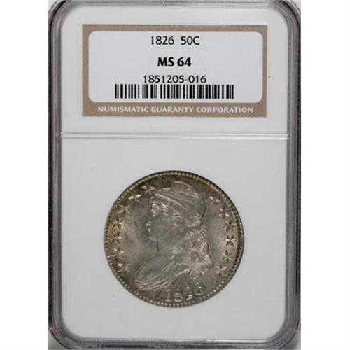 <B>1826 50C MS64 NGC.</B></I> O-112a, R.2. Die chips inside the N in UNITED, along with a filled top loop of the first S in STATES, determine the Overton marriage. Light golden toning is limited to the margins. Lustrous, well preserved, and crisply struck despite minor blending of detail on the left (facing) claw.<BR><BR><B>Coin Engraver:</B> John Reich<BR><BR><b>Shipping:</b> Coins & Currency (<a target="_blank" href="http://www.heritageauctions.com/common/shipping.php">view shipping information</a>)