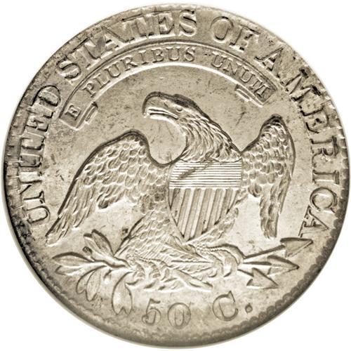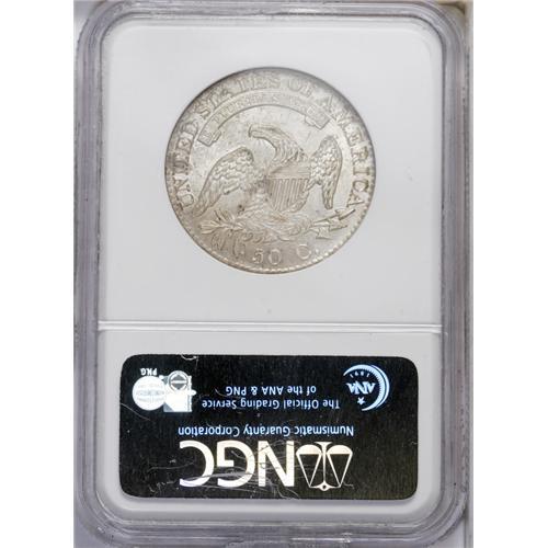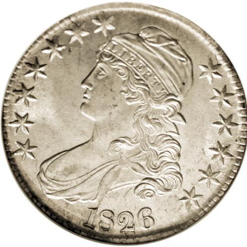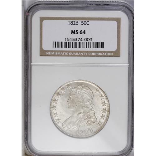 <B>1826<50C> MS64 NGC.</B></I> O-118a, R.1. Delicate olive-gray patina denies full brilliance, but this lustrous near-Gem is refreshingly void of marks. The strike is also bold, aside from minor softness on the centers of stars 6 and 7, and on the right side claws. Capped Bust halves are available in Uncirculated grades, but high quality pieces remain elusive.