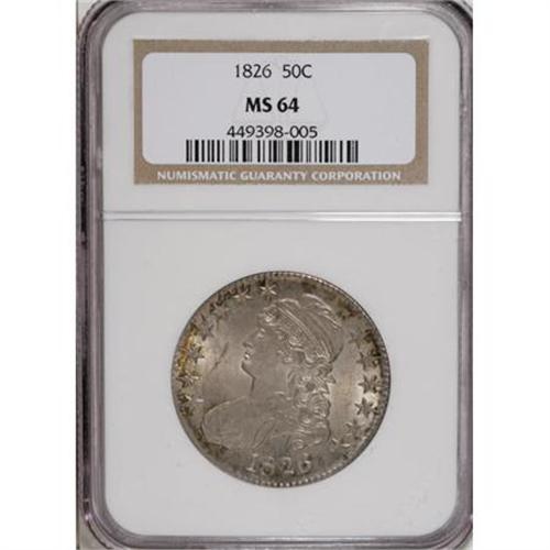 <B>1826 50C MS64 NGC.</B></I> O-114, High R.4. A partially filled N in UNITED is diagnostic for this scarce die pairing. An impressively unabraded near-Gem with comprehensive luster and predominant cream-gray toning. The borders offer glimpses of apple-green and tan. The major devices are intricately struck, while the stars are mostly bluntly impressed. Finest listed in Herrman's Autumn 2007 listing is AU58, the present coin exceeds that by five grades.<BR><BR><B>Coin Engraver:</B> John Reich<BR><BR><b>Shipping:</b> Coins & Currency (<a target="_blank" href="http://www.heritageauctions.com/common/shipping.php">view shipping information</a>)