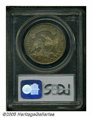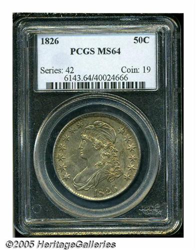 <B>1826<50C> MS64 PCGS.</B></I> O-118a, R.1. This lovely near-Gem possesses variegated golden-brown and dove-gray color. Luster sweeps across the nearly unblemished surfaces. The portrait is particularly smooth. Generally well struck, the stars and legends are slightly stretched toward the rims, typical of later die stages of the Lettered Edge type.