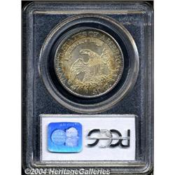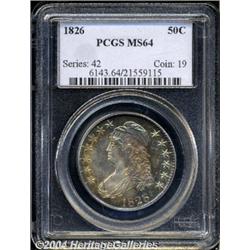 <B>1826<50C> MS64 PCGS.</B></I> O-104, R.3. Intermediate die state with die crack plainly visible under the arrowheads and denomination, but lacking along the base of RICA in AMERICA. Intermingled shades of turquoise and amber toning provide unique coloration, but have no ill-effect on the coin's scintillating luster. <BR><BR><B>Important notice:</B> Heritage usually auctions material at the rate of 200-250 lots per hour. On some occasions eBay Live bid software or the Internet may not be able to keep up with the pace of the auction. We recommend placing a realistic absentee bid now as insurance to avoid disappointment. Occasionally the auctioneer may eliminate or reject an eBay Live bid, and the auctioneer may also reopen a lot after the close of the eBay live bidding (usually because we missed an audience bid), and may reject your bid even if it shows you as the winning bidder. By bidding via eBay Live, you agree that Heritage may award the lot to another bidder at its sole discretion under the circumstances described above or any other reasonable circumstances. Since eBay bids are not shown to us until we open the lot on the floor, we treat those bids just like floor bids. In most cases the floor responds before the eBay bid is presented to us, due to Internet lag time, so for consistency we have made it a policy that floor bids are always considered first over tie eBay live bids. Also please note that all Heritage lots purchased through eBay Live carry a 20% Buyer's Premium. Please make sure you read the Terms and Conditions before you bid.