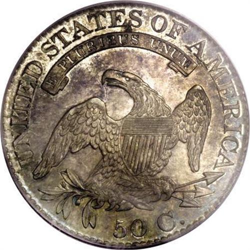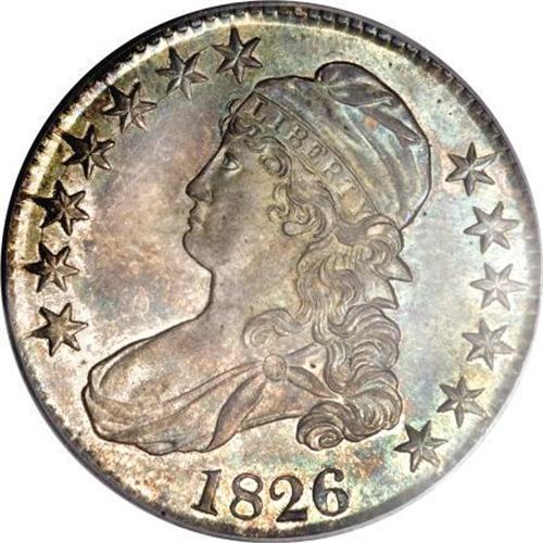<B>1826 50C MS64 PCGS.</B></I> O-104, R.3. A die crack joins all stars on the left, and the I in PLURIBUS is centered under the left side of the second T in STATES. Medium intensity multicolored toning bathes both sides of this sharply struck near-Gem. A few minute handling marks do not disturb. The reverse is rotated approximately 20 degrees. Population: 90 in 64, 36 finer (12/07).<BR><BR><B>Coin Engraver:</B> John Reich<BR><BR><b>Shipping:</b> Coins & Currency (<a target="_blank" href="http://www.heritageauctions.com/common/shipping.php">view shipping information</a>)