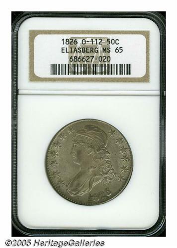<B>1826<50C> MS65 NGC.</B></I> Ex: Eliasberg. O-112, R.2. A beautiful light silver-gray Gem, intricately struck and with unbroken cartwheel shimmer. The Eliasberg catalog observed, "this is the finest specimen of O-112 known to us or reported in the literature." The NGC population data does not disagree; in fact, the closest competitors certified as O-112 by that service are two pieces graded MS62.<BR><I>Ex: Louis E. Eliasberg, Sr. Collection (Bowers and Merena, 4/97), lot 1825, which realized $2,750.</B></I>