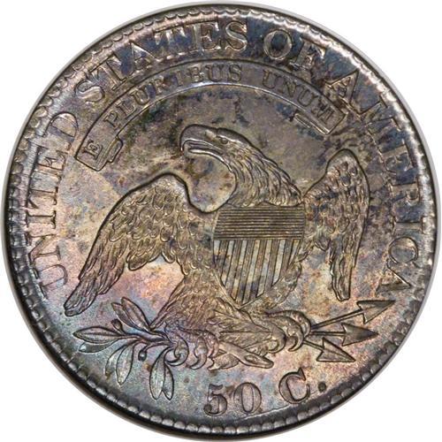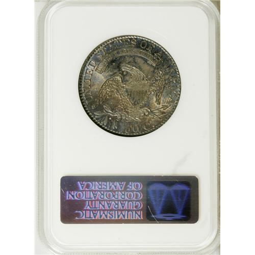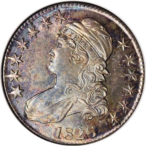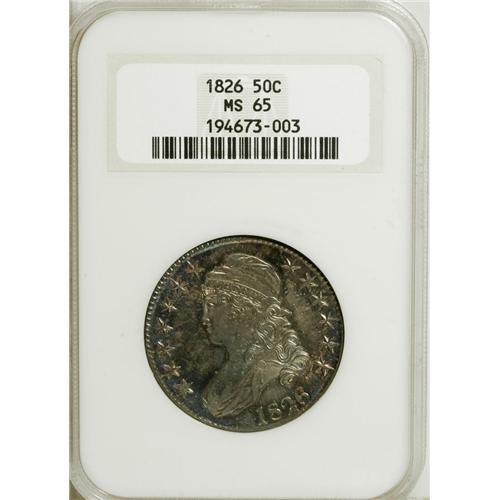 <B>1826 50C MS65 NGC.</B></I> O-104a, R.3. A die crack from the rim near the bust joins all stars on the left. Die cracks beneath portions of AMERICA, 50 C, and the arrowheads identify the later Overton die state. Cartwheel luster readily penetrates the vigorous ocean-blue, rose, and olive patina. This impressive Gem is boldly struck, since only star 1 and the eagle's right (facing) claw lack penetrating definition. Nearly unmarked, and encapsulated in an older-generation NGC holder.<BR><BR><b>Shipping:</b> Coins & Currency (<a target="_blank" href="http://www.heritageauctions.com/common/shipping.php">view shipping information</a>)