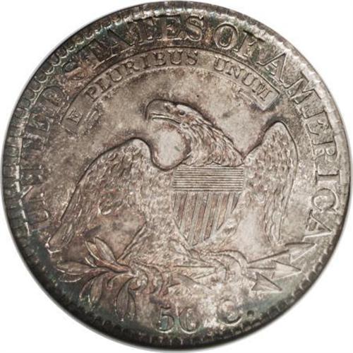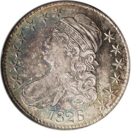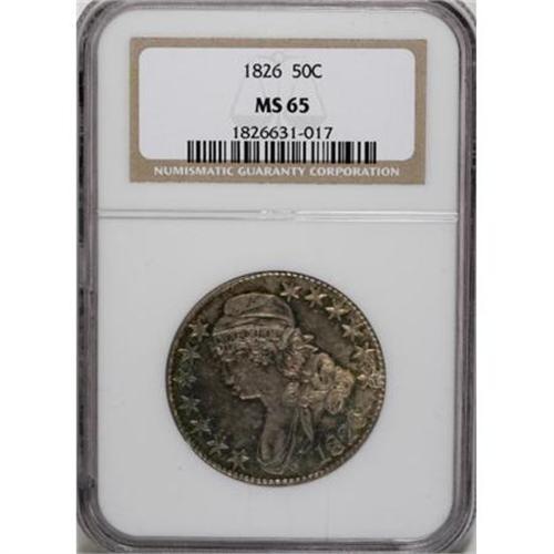 <B>1826 50C MS65 NGC.</B></I> O-102, R.1. Eye-catching ocean-blue, gold, and ivory-gray embrace this unabraded and crisply struck representative. The reverse is particularly lustrous. Overton-102 is noteworthy for the location of star 7, which nearly touches Liberty's cap. A flaw on the upper serif of the E within the scroll confirms the attribution. Census: 51 in 65, 24 finer (8/07).<BR><BR><B>Coin Engraver:</B> John Reich<BR><BR><b>Shipping:</b> Coins & Currency (<a target="_blank" href="http://www.heritageauctions.com/common/shipping.php">view shipping information</a>)