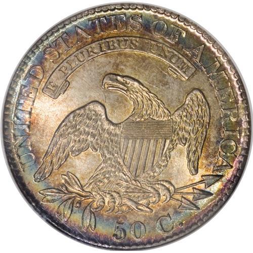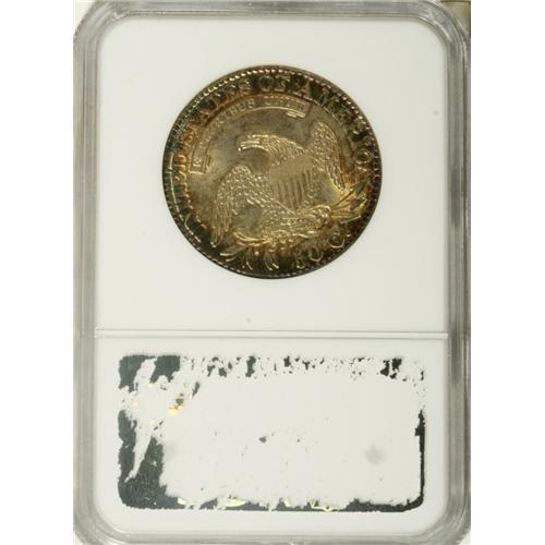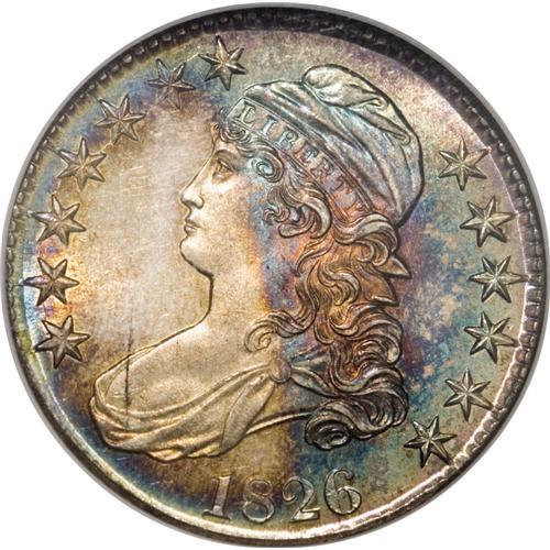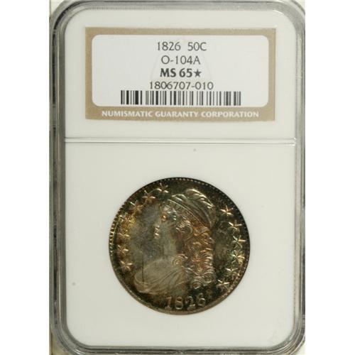 <B>1826 50C MS65 <img border='0' src='http://www.heritagecoins.com/images/star.gif' width=10 height=10> NGC.</B></I> O-104, R.3. While identified as O-104a on the holder, we can find no evidence of the reverse die crack that is required for the late die state. Intense aqua-blue and gold toning over the entire obverse, with the gold relegated to the left side, the blue and rose-gold on the right, with splashes also found around the periphery. The toning is more organized on the reverse, but with the same color palette. On the secondary side, we note intense sunset-gold predominating with bright sky blue and rose capturing the peripheral realm. Such rainbow toning is always a delight to see, and adds greatly to even the most circulated silver coin. Toning of this intensity combined with strong luster and coupled with a Gem coin make for quite a numismatic treat. Examination of the surfaces will find a couple of tiny neck nicks on Liberty. Fairly well struck for the die pairing and a wonderful piece of eye candy to treat any numismatist. This is the only MS65 <img border='0' src='http://www.heritagecoins.com/images/star.gif' width=10 height=10> 1826 half dollar certified by NGC (12/06).<BR><I>From The Rocky Top Collection of Bust Half Dollars.</B></I><BR><BR><b>Shipping:</b> Coin/Currency (<a target="_blank" href="http://www.heritageauctions.com/common/shipping.php">view shipping information</a>)