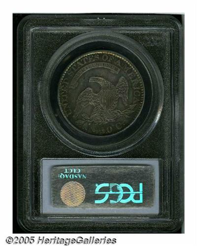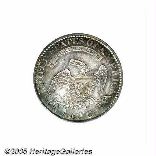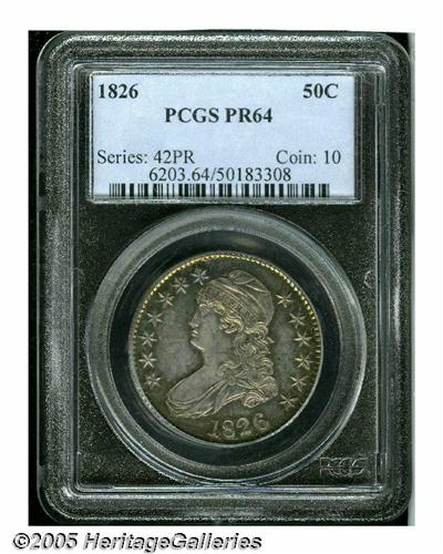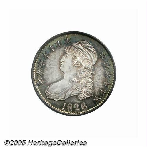 <B>1826<50C> PR64 PCGS.</B></I> O-101, R.2. (R.7 as a proof). When Walter Breen authored his proof <I>Encyclopedia</B></I> after years of extensive observation, he had never heard of this variety being used to produce a proof striking. Later, when Breen added another fifteen years of numismatic research and note taking, producing his magnificent <I>Complete Encyclopedia,</B></I> he did note that one proof was reported from this die pairing, and this may well be that coin. All told, the proof mintage for 1826 Half Dollars is thought to have been less than ten coins, most being from the O-102 die marriage.<BR> One of the most appealing aspects of this rarity is the phenomenal color. The margins have splendid cobalt-blue accents while the centers are primarily pearl-gray and golden-rose. The major design elements are frosted, and provide ample contrast with the subtly reflective fields. Beneath the bust of Liberty, there are faint pinscratches extending nearly to the date, and these will serve to identify this coin in the future. An important rarity for the advanced Bust Half Dollar collector. Population: 1 in 64, 0 finer, NGC has certified a single PR65 (6/05).