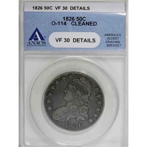 <B>1826 50C --Cleaned--ANACS. VF30 Details.</B></I> O-114. NGC Census: (7/1039). PCGS Population (16/1022). Mintage: 4,000,000. Numismedia Wsl. Price for NGC/PCGS coin in VF30: $60. (#6143)<BR><BR><B>Coin Engraver:</B> John Reich<BR><BR><b>Shipping:</b> Coins & Currency (<a target="_blank" href="http://www.heritageauctions.com/common/shipping.php">view shipping information</a>)