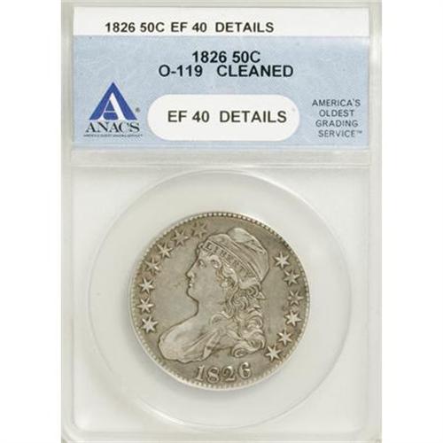 <B>1826 50C --Cleaned--ANACS. XF40 Details.</B></I> O-119. NGC Census: (27/1225). PCGS Population (60/937). Mintage: 4,000,000. Numismedia Wsl. Price for NGC/PCGS coin in XF40: $82. (#6143)<BR><BR><B>Coin Engraver:</B> John Reich<BR><BR><b>Shipping:</b> Coins & Currency (<a target="_blank" href="http://www.heritageauctions.com/common/shipping.php">view shipping information</a>)