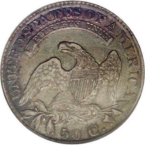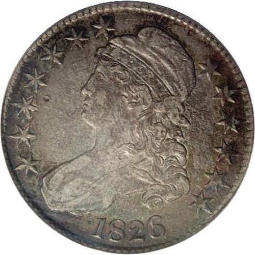 <B>1826<50C> XF40--Obverse Damage--NCS. XF Details.</B></I> O-103, Low R.5. The high 6 in the date, recut upright of 5 in 50 C., and star 7 pointing to the upper edge of Liberty's headband confirm the attribution of this rare variety. NCS' conservation has mitigated obverse damage so that remaining flaws include scattered porous areas that mostly blend with the green-gray toning, several pinscratches noted with a loupe, and a small circular dig to the right of stars 3 and 4. The reverse has few distractions worth noting, although both sides are struck from highly eroded dies. The strike is full, however, and the coin retains considerable eye appeal.<BR><I>Ex: Stack's (6/15/1982).</B></I> Envelope Included.