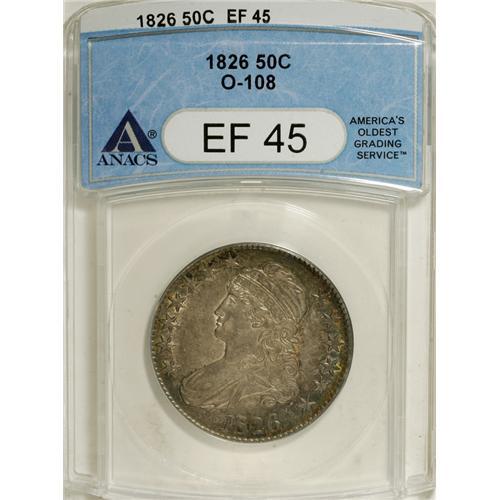 <B>1826 50C XF45 ANACS.</B></I> O-108. NGC Census: (65/907). PCGS Population (75/808). Mintage: 4,000,000. Numismedia Wsl. Price for NGC/PCGS coin in XF45: $131. (#6143)<BR><BR><b>Shipping:</b> Coins & Currency (<a target="_blank" href="http://www.heritageauctions.com/common/shipping.php">view shipping information</a>)