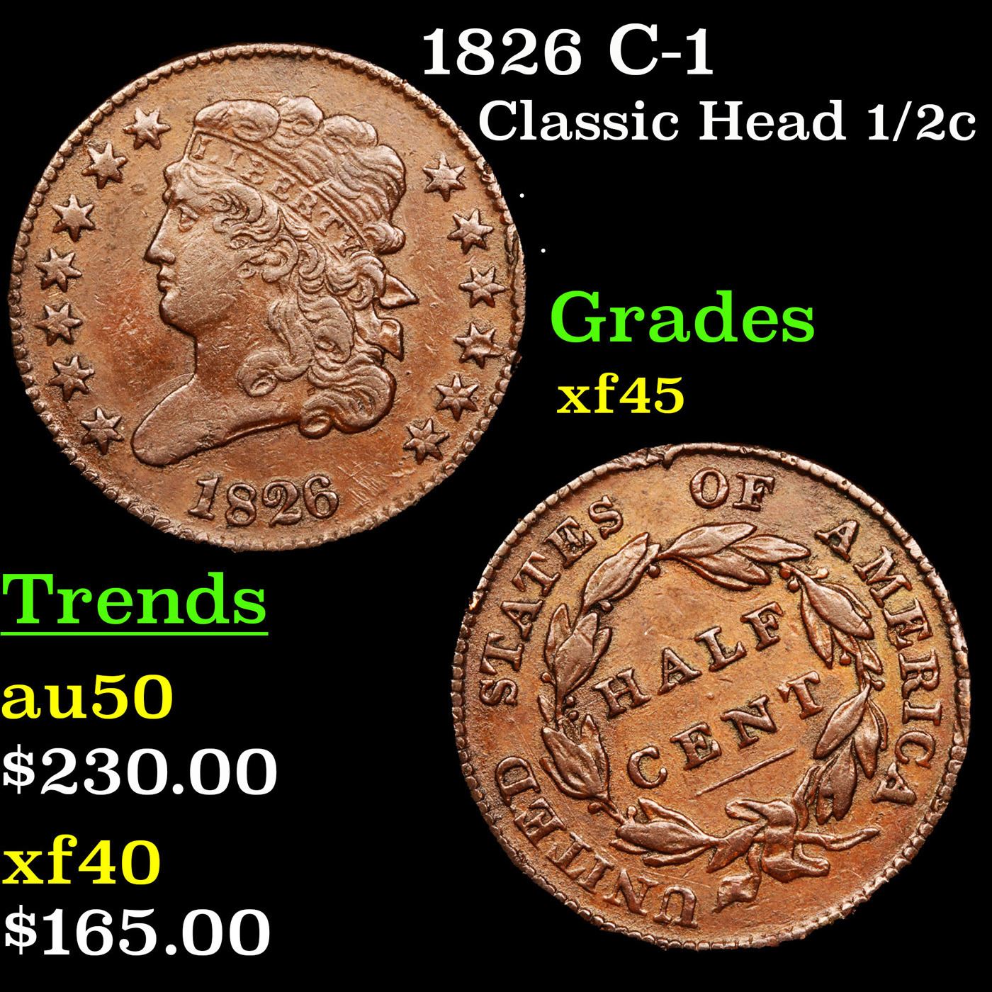 1826 C-1 Classic Head half cent 1/2c Grades xf+.