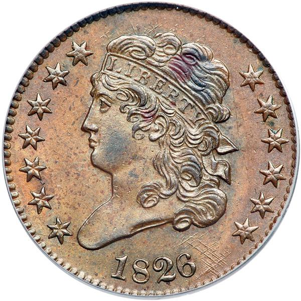 1826 C-1 R1. PCGS graded MS-63 Brown. Frosty light to medium brown with a splash of reddish olive toning in the hair over ER in LIBERTY with similar toning at ITE in UNITED and AT in STATES. Otherwise the surfaces are choice, void of any notable distractions. MDS, Manley state 3.0. Our grade is net AU50.