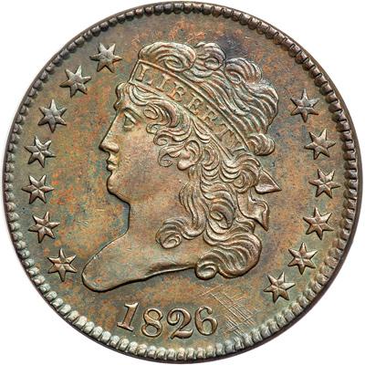 1826 C-1 R1. PCGS graded MS-63 Brown. Frosty medium brown and olive. The toning on both sides is a bit mottled, and this piece may have been lightly cleaned and retoned. A spot of dark toning rests on top of the head. Nicely struck E-MDS, Manley state 2.0. A fine die crack connects the bust tip to star 1 and the die lines right of the date and above the head are clear. Our grade is AU55.