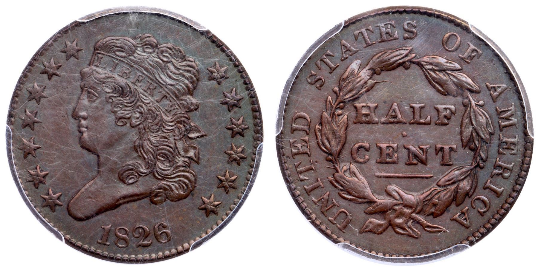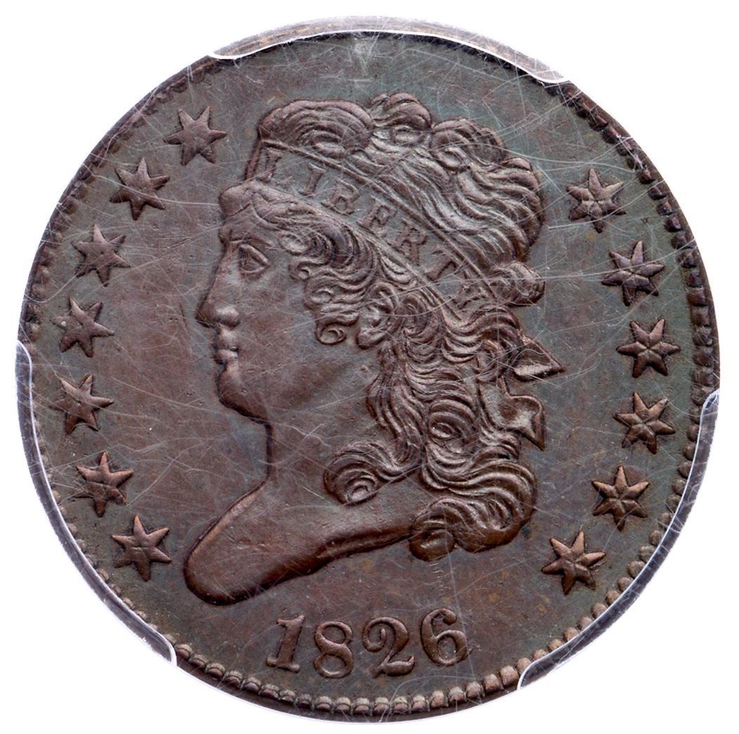 1826 C-2 R-3+ PCGS MS62BNLightly cleaned and nicely retoned a glossy bluish steel and golden olive with sea-green overtones. No spots or other marks. Excellent eye appeal in spite of the light cleaning. EDS, Manley state 1.0, with slightly reflective obverse fields. Plated in the Breen encyclopedia on page 326 to illustrate his die state I and listed in the condition census on page 327. The repunching on the 6 is clear and there are no die clashmarks. Our grade is MS60 sharpness net AU55. The attribution and Missouri Cabinet provenance are shown on the PCGS label.Certificate Number: 35255.62/27392699Pedigree: Ex John Work Garrett 6/26/1942-Garrett Estate-Johns Hopkins University, Bowers and Ruddy Galleries, Inc., 11/28/1979:23 ($302.50)-William R. (Bill) Weber (via Robert W. Everett) 4/1992- Goldberg 1/26/14:111 R. Tettenhorst-Missouri Cabinet (Mocab 26.2.6)-Bill Eckberg - CVM 5/3/19 at EAC - Bob Kebler Collection