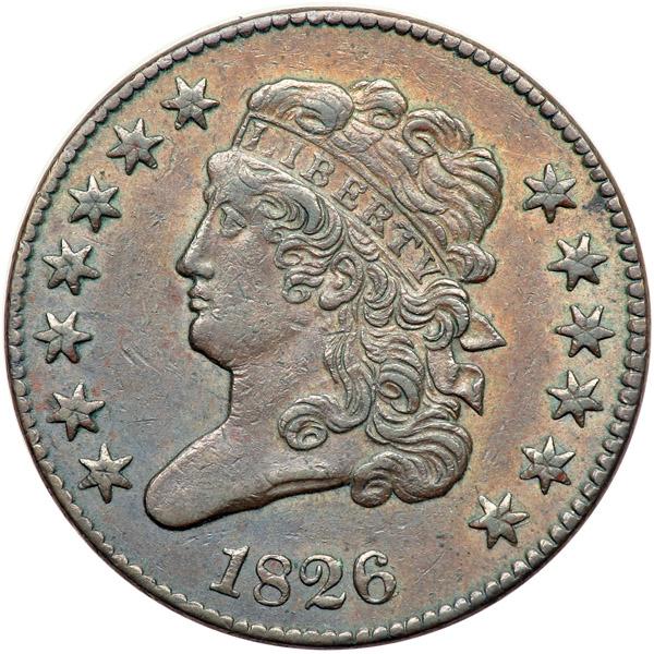 1826 C-2 R3+ EF40. Slightly sharper but there are too many tiny contact marks for the higher grade. None of these marks is at all distracting or visible without the aid of a glass. Glossy chocolate and steel with lots of frosty lighter steel brown and tan in protected areas. EDS, Manley state 1.0. The repunching on the right side of the 6 is clear, the fields are very slightly reflective, and there are no die clashmarks on the reverse. The reverse is rotated 10 degrees CCW. Noyes photo #74343.