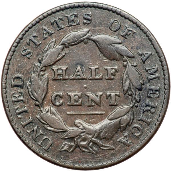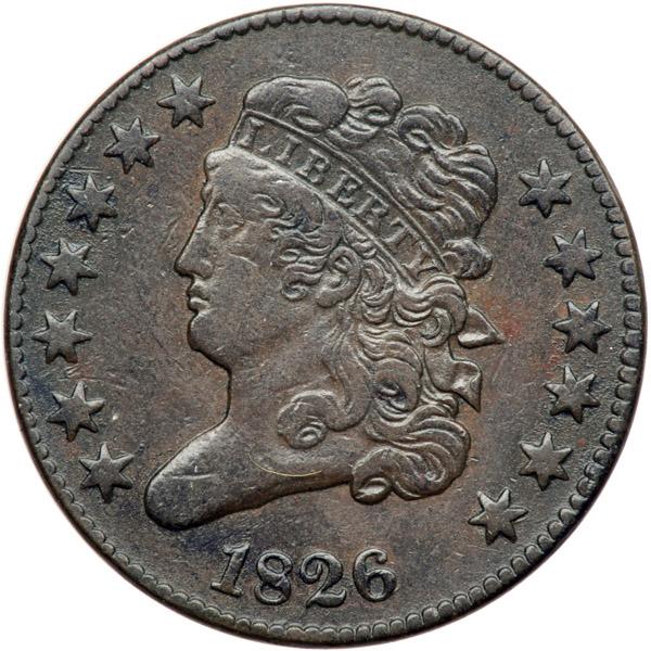 1826 C-2 R3+ F15. Sharpness closer to VF20 but there are a few very faint hairline scratches on the reverse, mostly under the wreath. These hairlines barely alter the attractive glossy olive brown and chocolate toning, and the eye appeal remains excellent. MDS, Manley state 3.0. The die clashmarks on the reverse are faint and the tiny die lines over T in UNITED are barely visible. The reverse is upset, the dies oriented head-to-head rather than the normal head-to-foot. This is the plate coin for the unbroken obverse in the first edition of the Cohen book. Davy #26.2.5.