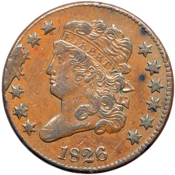 1826 C-2 R3+ VF20. Sharpness VF25 or slightly better but light contact marks cover the obverse, including a long, thin nick in the field before the nose. The only notable mark on the reverse is a small rim bruise over AT in STATES. Glossy light to medium brown with steel brown highpoints. Extremely rare LDS, Manley state 4.0, with a strong cud break that connects stars 4 & 5 to the rim. The strike at the top of TE in UNITED (which opposes the cud) is depressed because there was not enough planchet metal to fill both the strong obverse cud and the reverse designs. About ten examples are known in this terminal die state, and most of those are in low grade with significant defects. Davy #26.2.4.