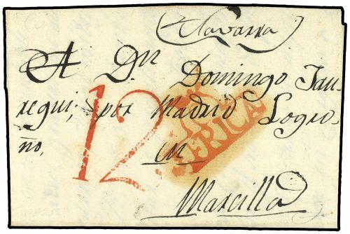 1826 CEUTA a MARCILLA (España). Marca C/AFRICA en rojo y tasa de "12" (cuartos) estampada a la llegada. MAGNIFICA.