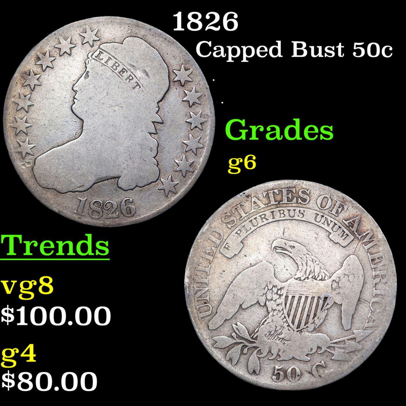 1826 Capped Bust Half Dollar 50c Grades g+.