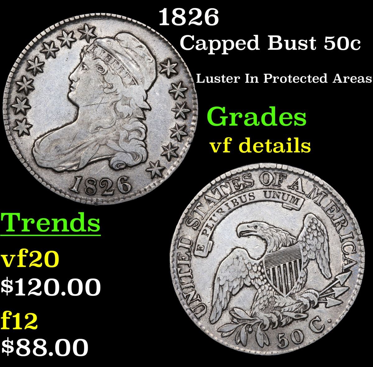 1826 Luster In Protected Areas . Capped Bust Half Dollar 50c Grades vf details.