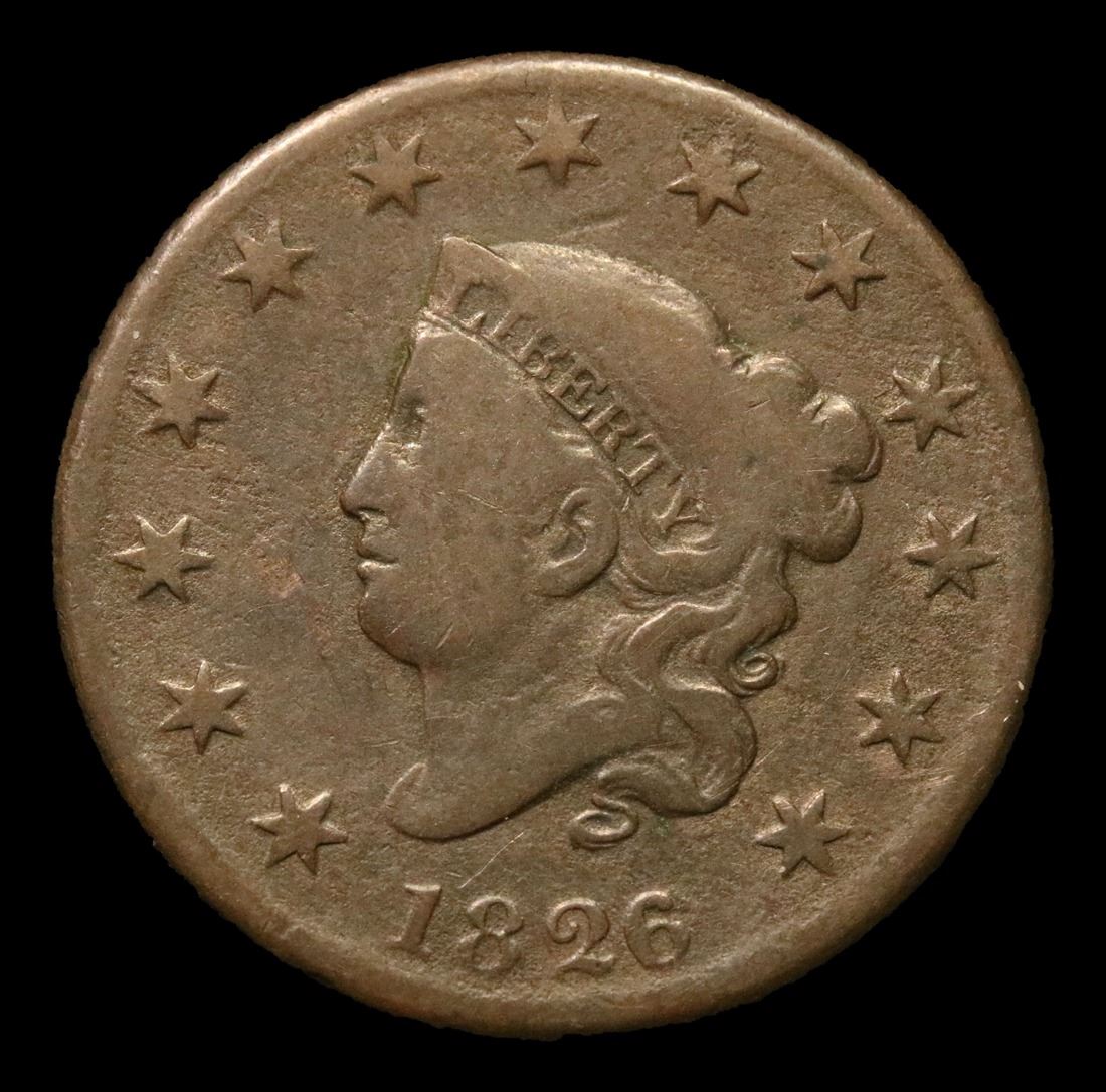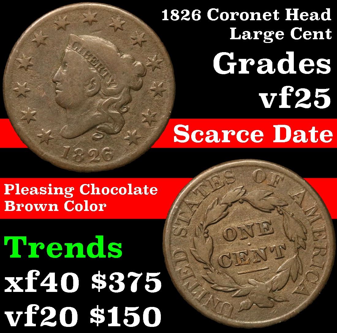1826 Coronet Head Large Cent 1c Grades vf+.