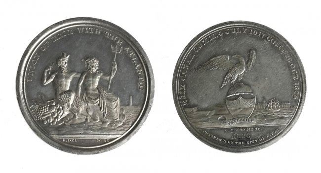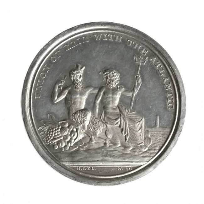 HK-1, 45mm in white metal, commemorative for the completion of the Erie Canal in 1826. The first "So-Called Dollar.", very popular US medal. Neptune and river god seated, reverse bears an eagle on globe over NY shield, canal locks in background. EF, proof-like but scuffed.