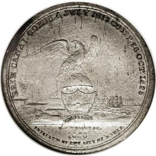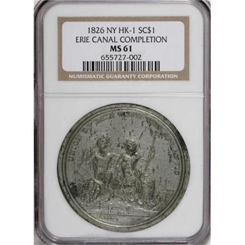 <B>1826 HK-1 Erie Canal Completion, MS61 NGC.</B></I> White metal. This is the highly desirable and collectible medal issued to mark the completion of the Erie Canal, or the "Union of Erie with the Atlantic" as inscribed on the obverse. The project was commissioned on July 4, 1817 and completed on October 26, 1825. This medal was issued by the Common Council of the City of New York, with dies engraved by Charles Cushing Wright after designs by Archibald Robertson. This pleasing piece has attractive pewter-gray surfaces that are splashed with darker toning on both sides. It is the first medal listed in the 1963 standard reference by Hibler and Kappen. Just a few months ago in February, we sold an NGC MS60 example of this same medal for $5,750.<B><BR></B></I><BR><BR><b>Shipping:</b> Coins & Currency (<a target="_blank" href="http://www.heritageauctions.com/common/shipping.php">view shipping information</a>)